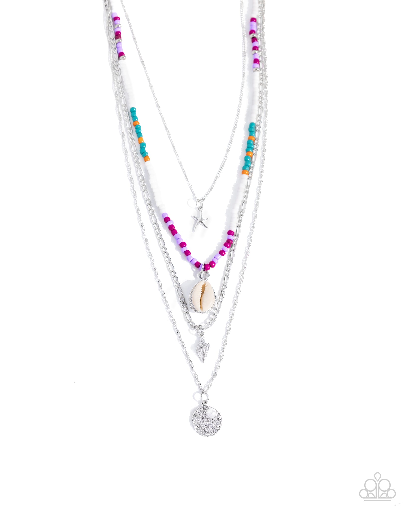 A collection of various silver chains, one infused with a collection of multicolored seed beads cascades in whimsical layers along the neckline. The uppermost chain features a dainty silver starfish charm, the seed-beaded strand features a white conch shell set against a silvery backdrop, and a shimmery seashell dangles from the chain below the colored strand. Featuring a dainty white pearl that rests against a coastal-inspired backdrop, a flat silver pendant glides from the lowermost chain for a summery finish. Features an adjustable clasp closure.