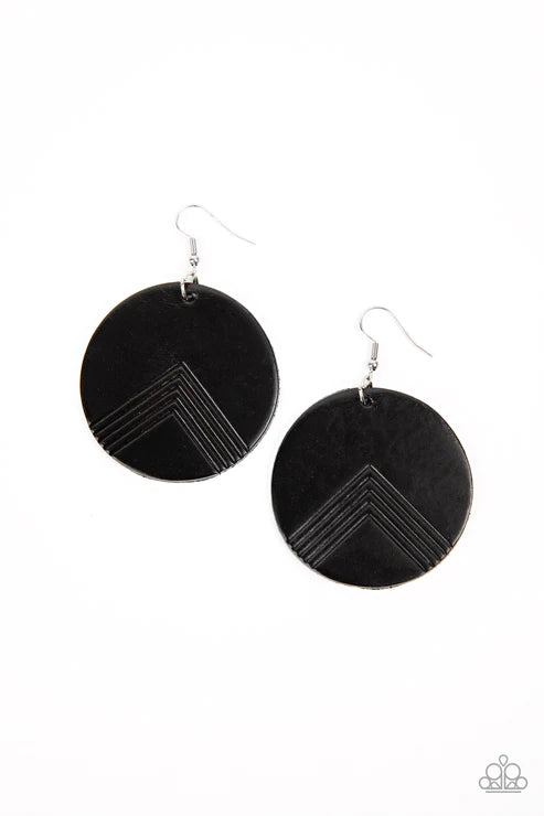 A black leather disc is etched in an angular geometric accent, creating a modern look. Earring attaches to a standard fishhook fitting.