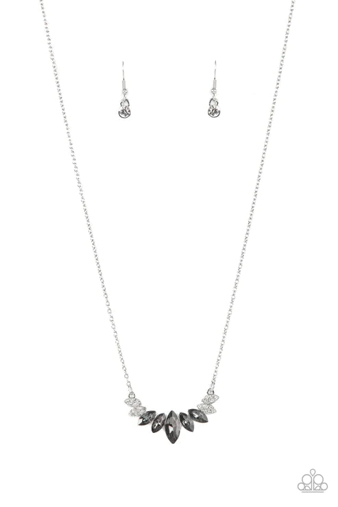 A fan of smoky marquise cut rhinestones is flanked by pairs of white rhinestone encrusted silver frames at the bottom of a dainty silver chain, resulting in a regal centerpiece below the collar. Features an adjustable clasp closure.