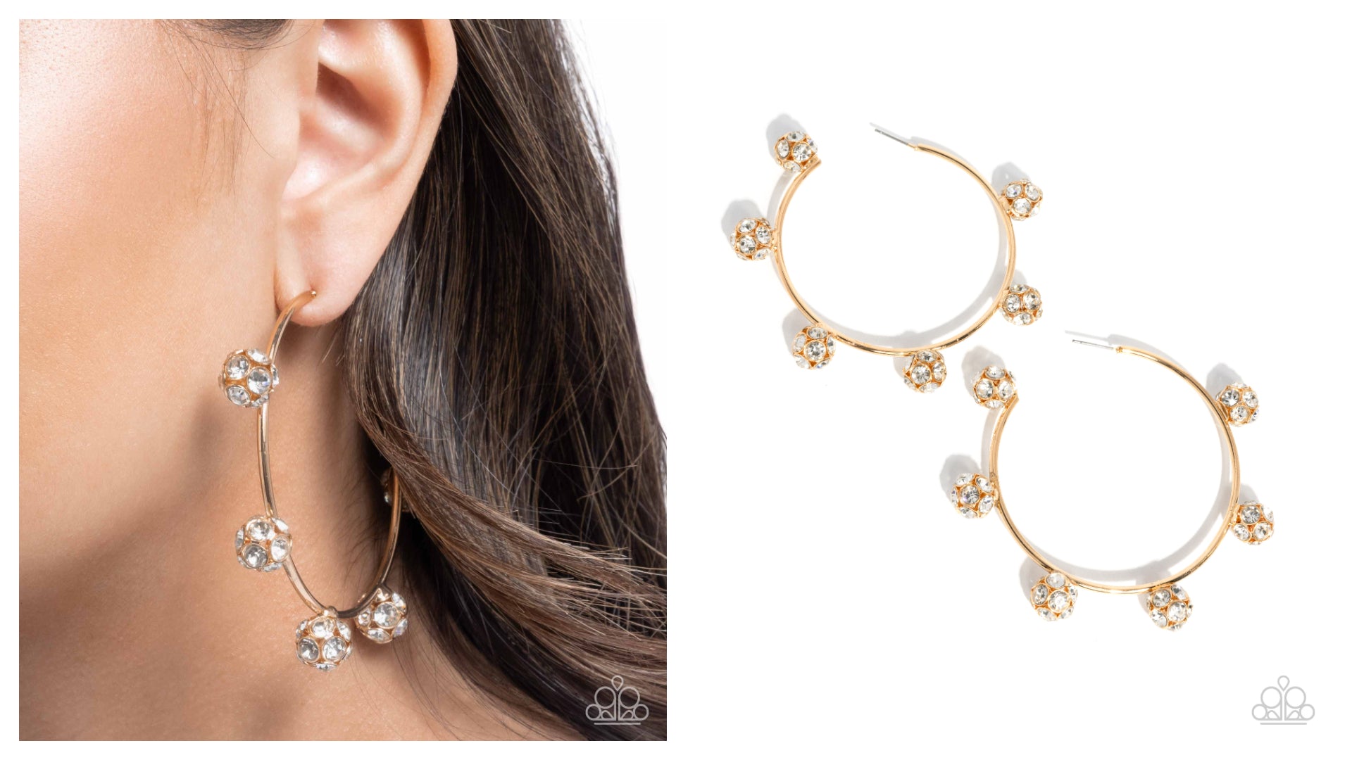 Dusted in white rhinestones, a classy collection of gold ornaments sporadically dot along the outside curve of a shiny, gold hoop for a radiantly posh finish. Earring attaches to a standard post fitting. Hoop measures approximately 3" in diameter.