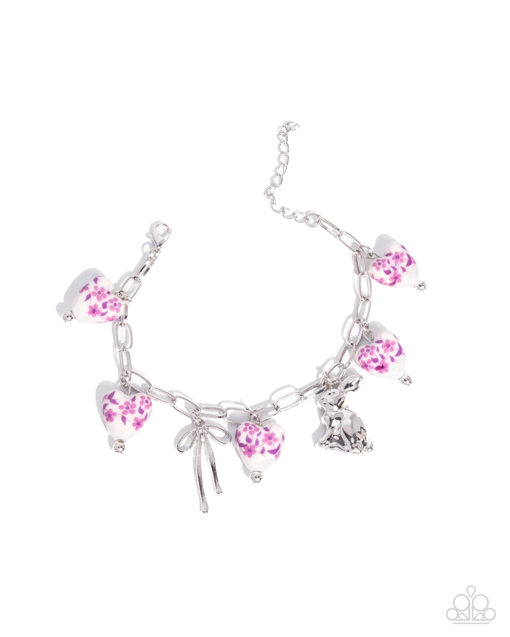Bracelet: Modeled after porcelain, a collection of slightly pinched delicately painted white hearts with a purple floral pattern across their centers sway beside a silver rabbit and a silver bow around the wrist from a silver paperclip chain for a heartfelt, handmade statement. Features an adjustable clasp closure.