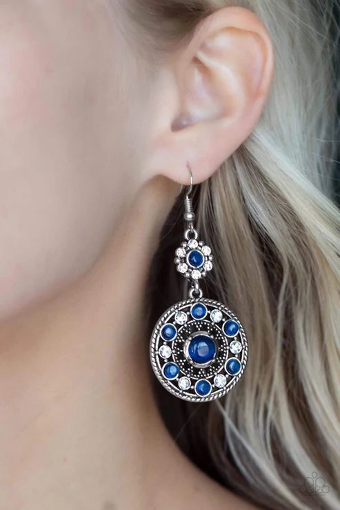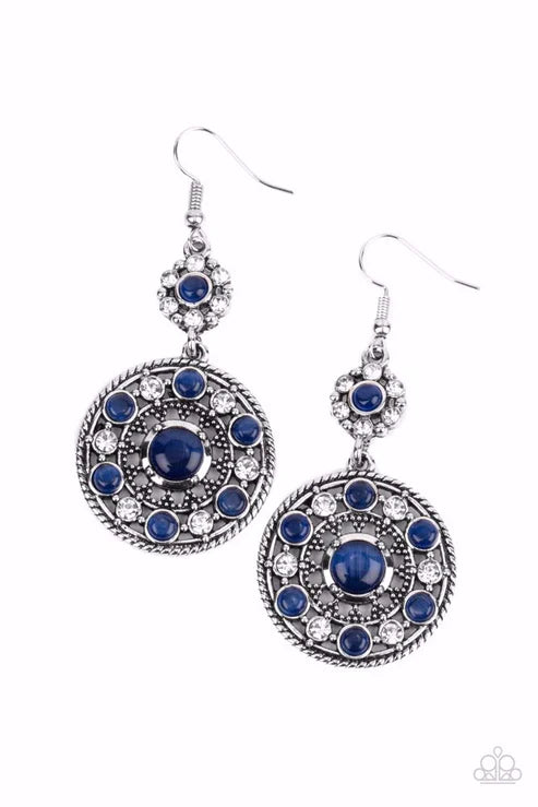 A bubbly collection of Mykonos Blue cat's eye stones and glassy white rhinestones embellish the front of a studded silver frame. The circular frame swings from the bottom of a matching floral fitting, creating an effervescent fashion. Earring attaches to a standard fishhook fitting.