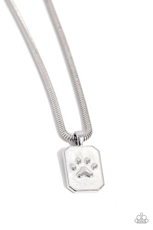 Dangling from a sleek silver snake chain, a rectangular pendant glides down the chest. Featured within the pendant, a silver pawprint, surrounded by white pearl paint creates an elegant pet-inspired pendant. Features an adjustable clasp closure.