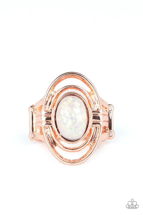 A sparkly opalescent bead is nestled between rippling rose gold ovals, creating an ethereal frame atop the finger. Features a stretchy band for a flexible fit.