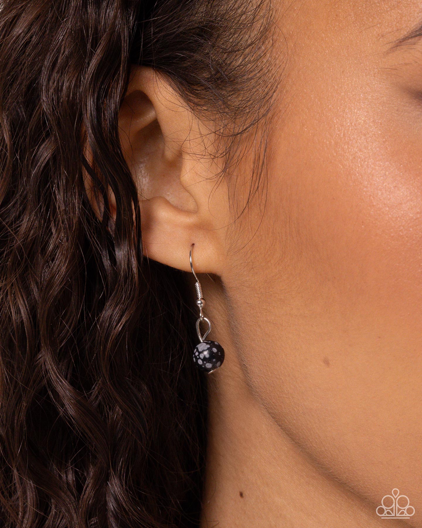 Pressed into a thick circular frame, a black and white-spotted stone dangles from the ear for an elegantly earthy display. Earring attaches to a standard fishhook fitting. As the stone elements in this piece are natural, some color variation is normal.