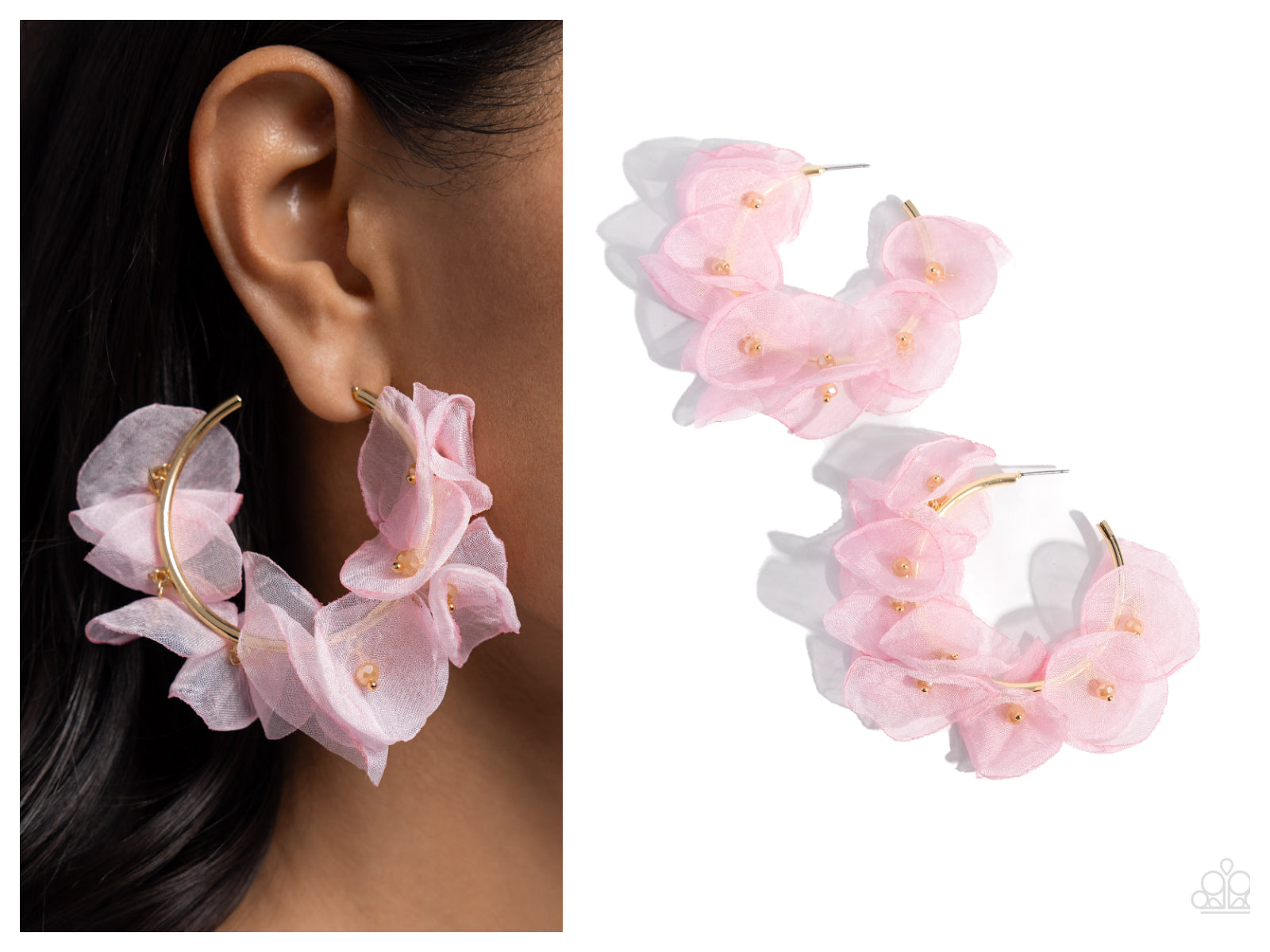 A classy collection of baby pink chiffon flowers with dainty Desert Flower faceted beaded centers are wrapped along the outside curve of a shiny, gold hoop by shimmery gold wire for a whimsical, posh finish. Earring attaches to a standard post fitting. Hoop measures approximately 1 3/4" in diameter.