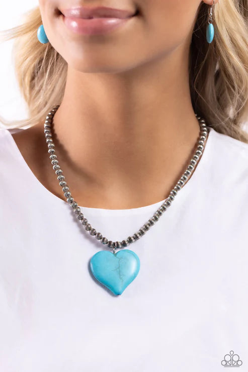 An oversized turquoise stone heart pendant swings from the bottom of a textured silver beaded display below the collar for a flirtatiously earthy fashion. Features an adjustable clasp closure. As the stone elements in this piece are natural, some color variation is normal.