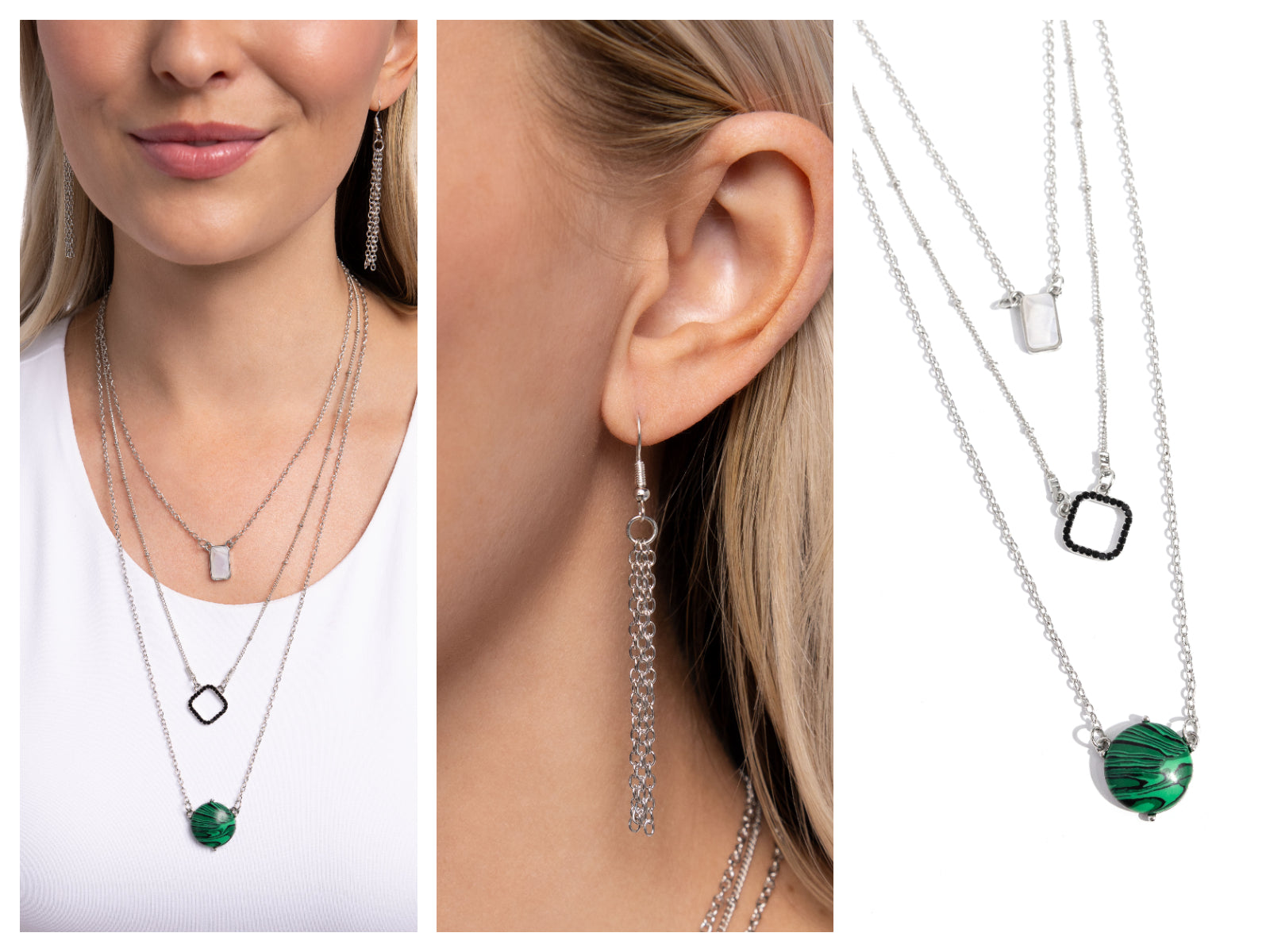 Infused with three colorful pendants, three shimmery silver chains layer across the chest. Pressed in a silver rectangular frame, a white shell swings from the uppermost chain above a jet-black rhinestone-encrusted diamond-shaped frame. A green-marbled stone hangs from the lowermost chain for a playful vibe. As the stone elements in this piece are natural, some color variation is normal.