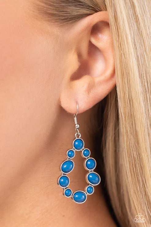 A bubbly collection of oval and round blue beads delicately coalesce into a teardrop frame, creating a refreshing pop of color. Earring attaches to a standard fishhook fitting.