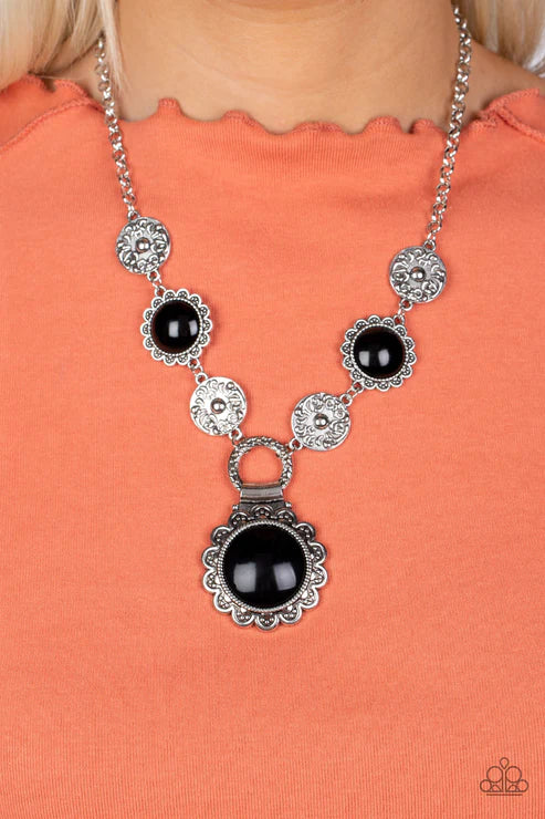 Shiny oversized black beads are wrapped in floral-inspired frames of silver, filled with studded texture. Silver discs embossed in a filigree motif alternate with the vibrant beads as they link along the collar, with a larger version of the black accents dropping below to create a whimsical pendant. Features an adjustable clasp closure.