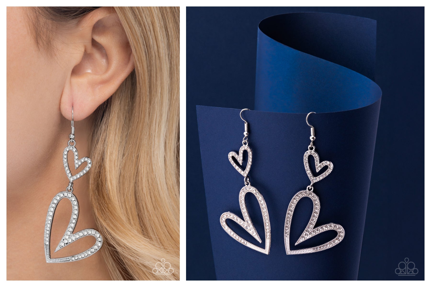 An oversized, rhinestone-encrusted shiny silver heart silhouette hangs from a smaller heart silhouette set in the same blinding shimmer for a romantic, eye-catching sparkle. Earring attaches to a standard fishhook fitting.