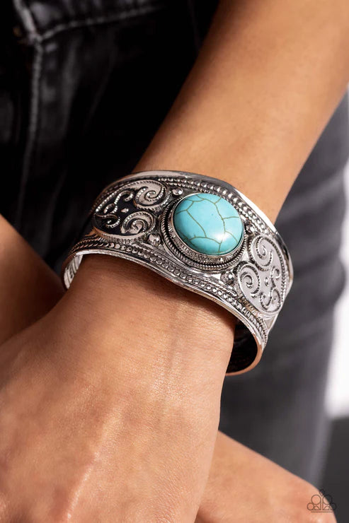 Two silver filigree heart accents flare out from a turquoise stone centerpiece atop an oversized silver cuff bordered in rows of dainty silver studs for a rustic flair.