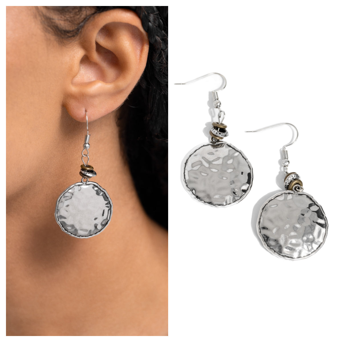 A dainty collection of rustic brass and hammered silver rings gives way to an antiqued silver disc. Bordered in an asymmetrical silver trim, the hammered disc ripples in the light with each turn and twist. Earring attaches to a standard fishhook fitting.