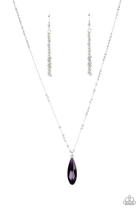 Encased in a sleek silver fitting, an elongated purple teardrop gem swings from the bottom of a classic silver chain below the collar for a timeless elegance. Features an adjustable clasp closure.