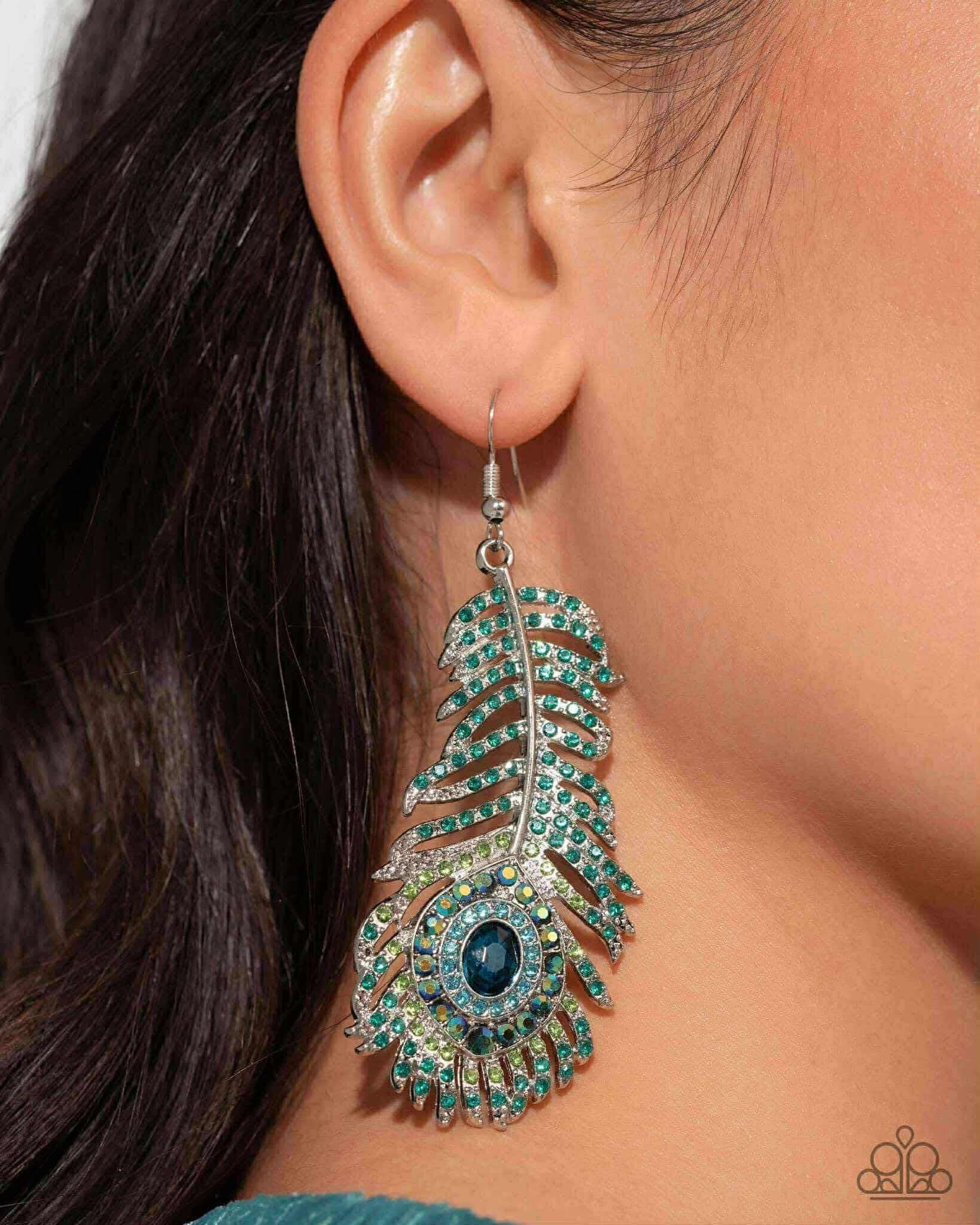 Dusted in aquamarine, emerald iridescent, green, and emerald rhinestones, curly ribbons of silver flair around a turquoise resin oval, creating a peacock feather-inspired centerpiece below the ear for a whimsically wild look. Earring attaches to a standard fishhook fitting. Sold as one pair of earrings.