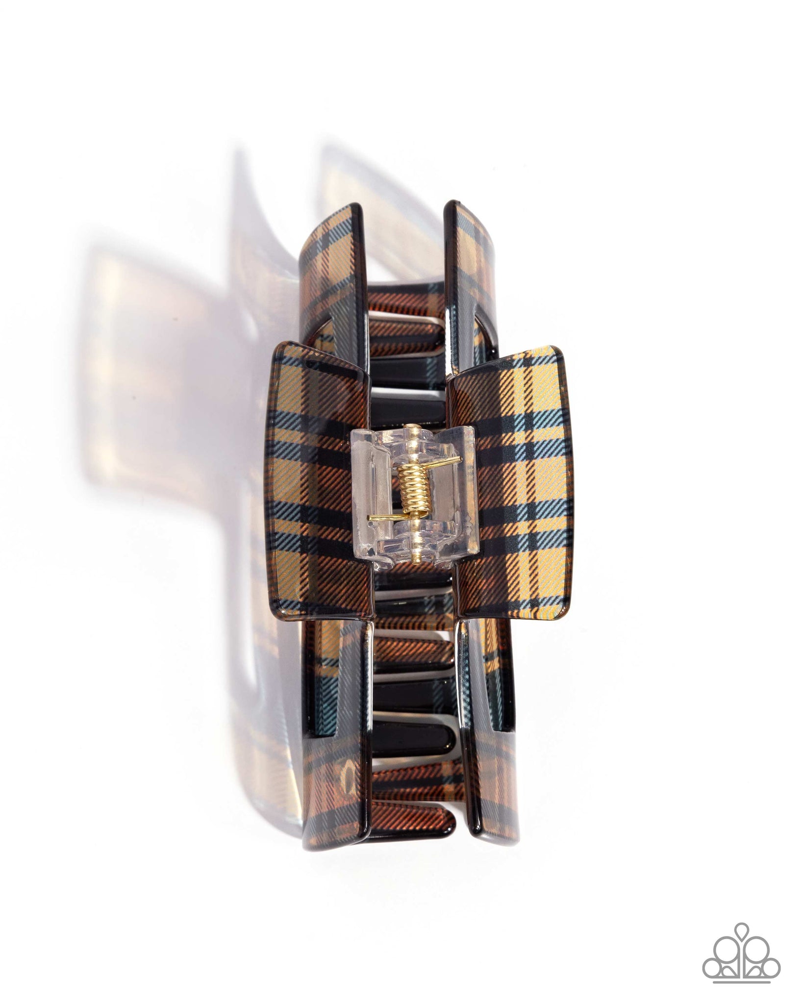 Featuring a brown plaid pattern, a polished claw clip holds the hair away from the face for an on-the-go preppy display. Clip measures approximately 2" in length and 4" in width.