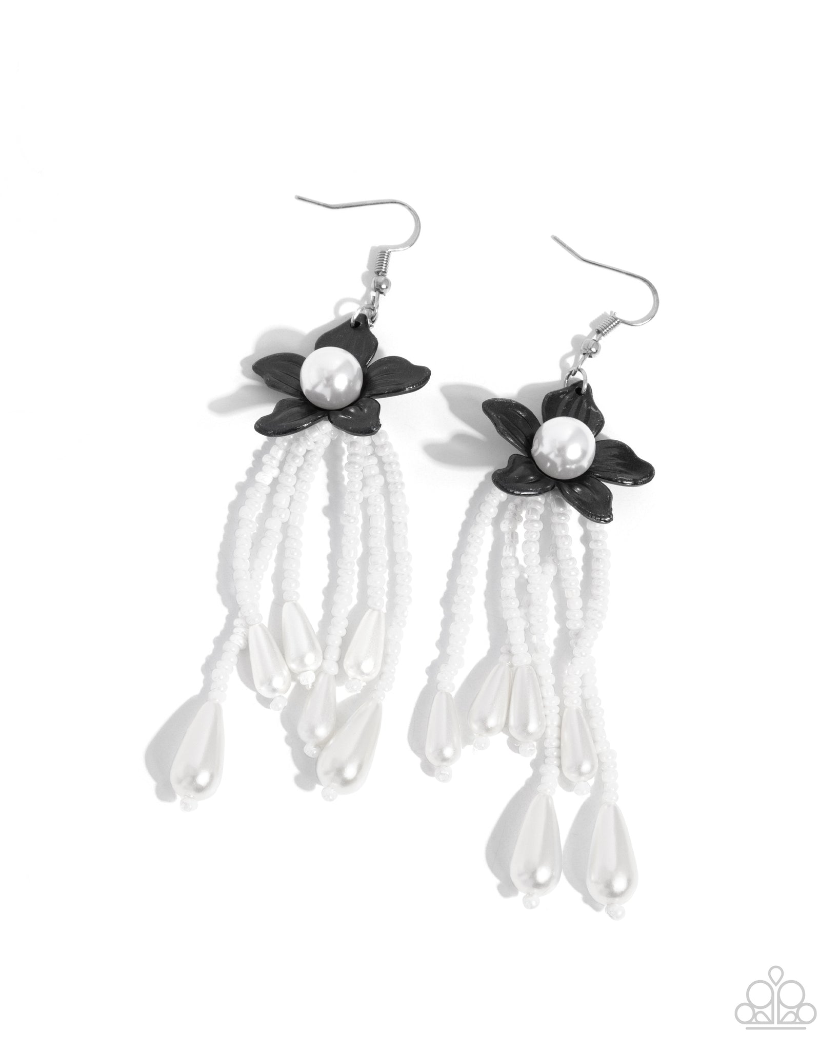 Featuring a white pearly center, a faceted dainty black flower blooms from the ear. Strands of pearly white seed beads cascade below the floral centerpiece giving way to oval white teardrop beads for a refined radiant look. Earring attaches to a standard fishhook fitting.