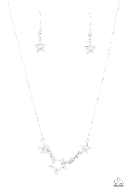 A mismatched collection of airy silver stars and white rhinestone dotted star frames delicately link below the collar, creating a stellar patriotic inspired pendant. Features an adjustable clasp closure.