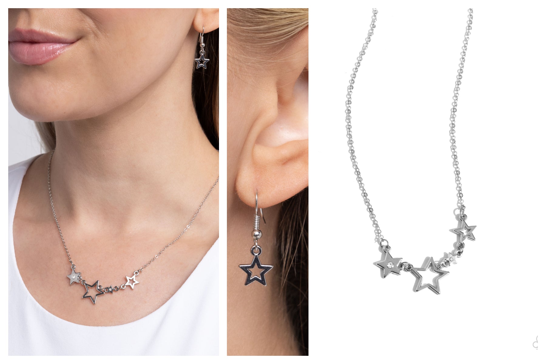 A mismatched collection of airy silver stars and white rhinestone dotted star frames delicately link below the collar, creating a stellar patriotic inspired pendant. Features an adjustable clasp closure.