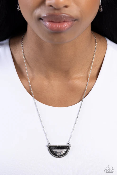 Encrusted in glittery black rhinestones, a hammered silver half moon pendant is horizontally suspended at the bottom of a dainty silver chain for an edgy glamour. Features an adjustable clasp closure.