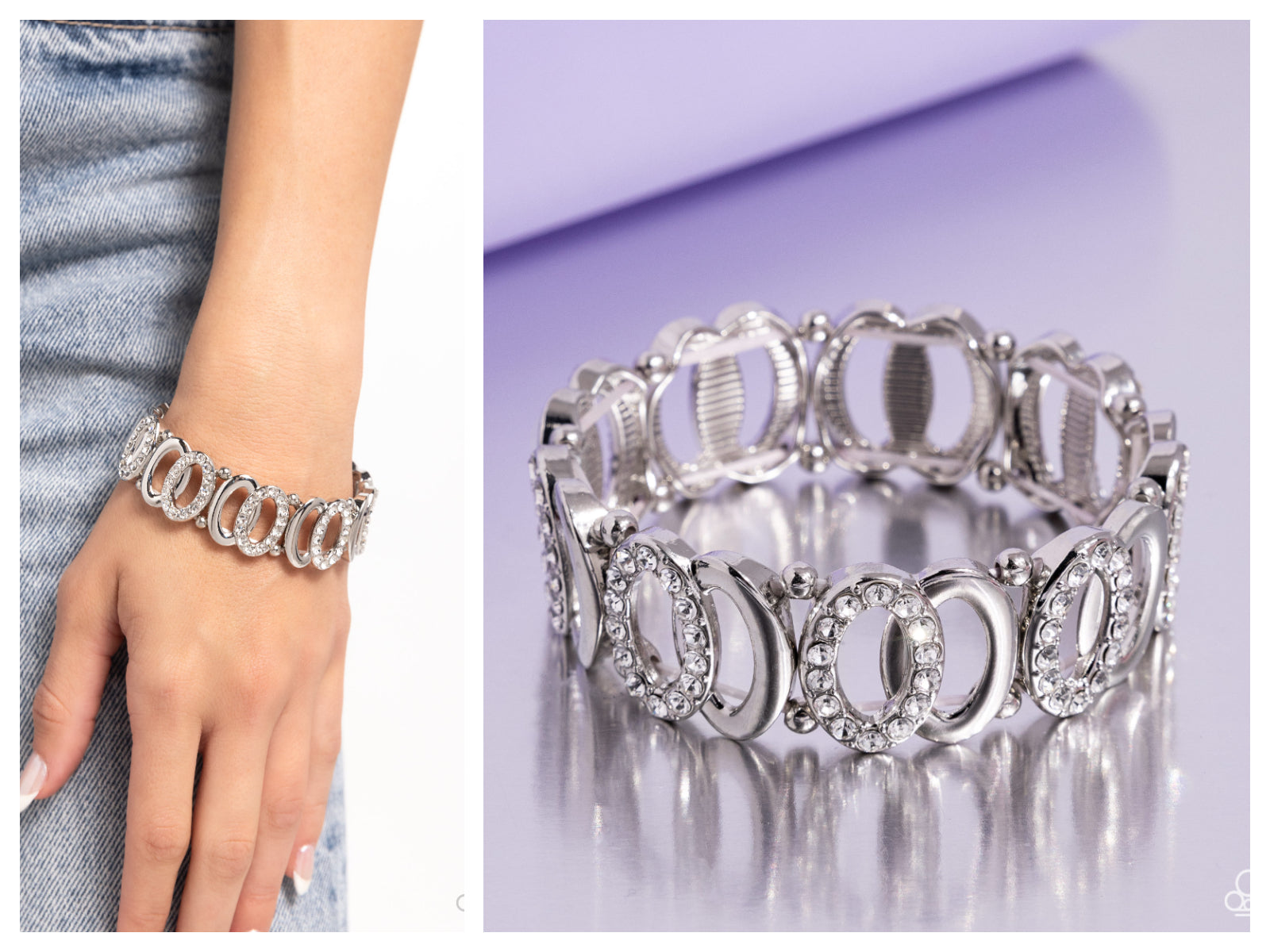 A collection of two interlocking silver ovals, one encrusted in white rhinestones, separated by a duo of silver beads wraps along the wrist on elastic stretchy bands for a timeless, twisted look.