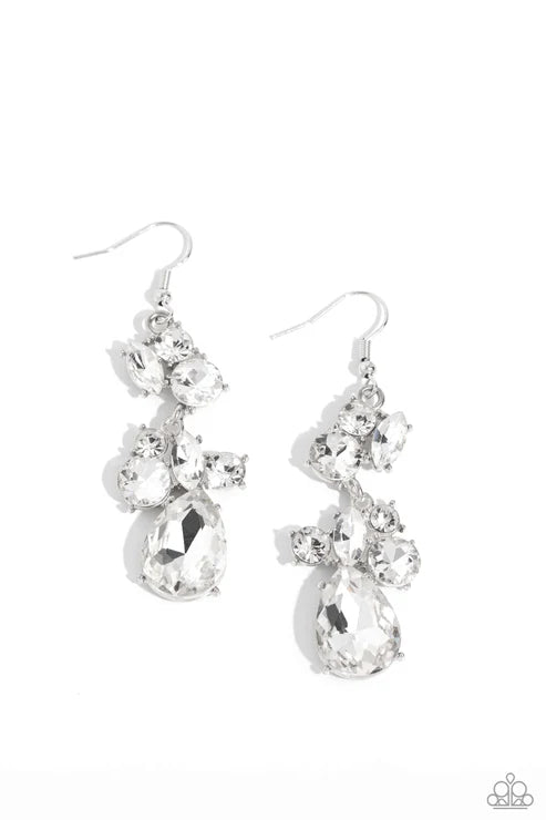 Round white rhinestones are sprinkled between marquise, round, and teardrop white rhinestones that delicately stack and link into an elegantly extended lure. Earring attaches to a standard fishhook fitting.