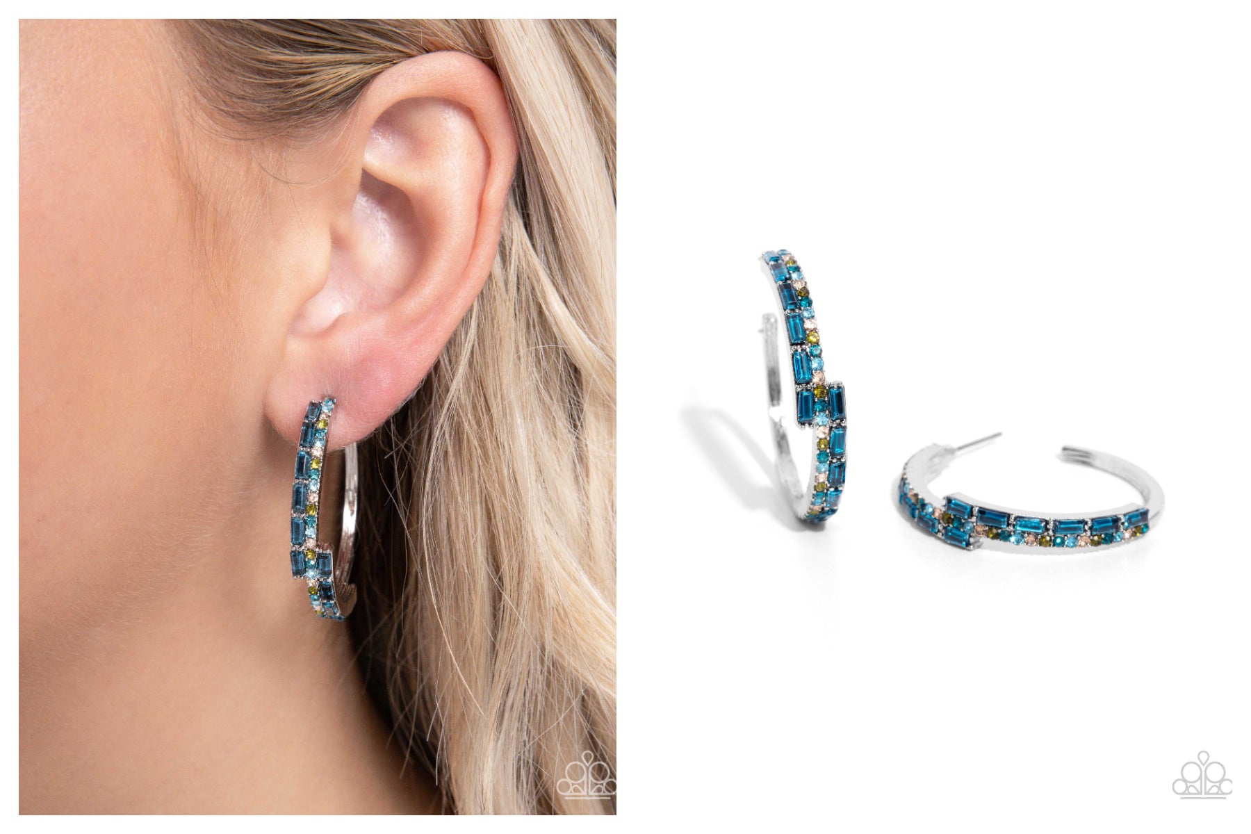Infused with glistening blue zircon, aquamarine, light peach, and olive rhinestones a thin silver hoop encircles the ear. Pressed in silver-pronged fittings emerald-cut blue gems delicately swoop asymmetrically along the silver hoop for additional glitz, completing the demurely layered look. Earring attaches to a standard post fitting. Hoop measures approximately 1 1/2" in diameter.