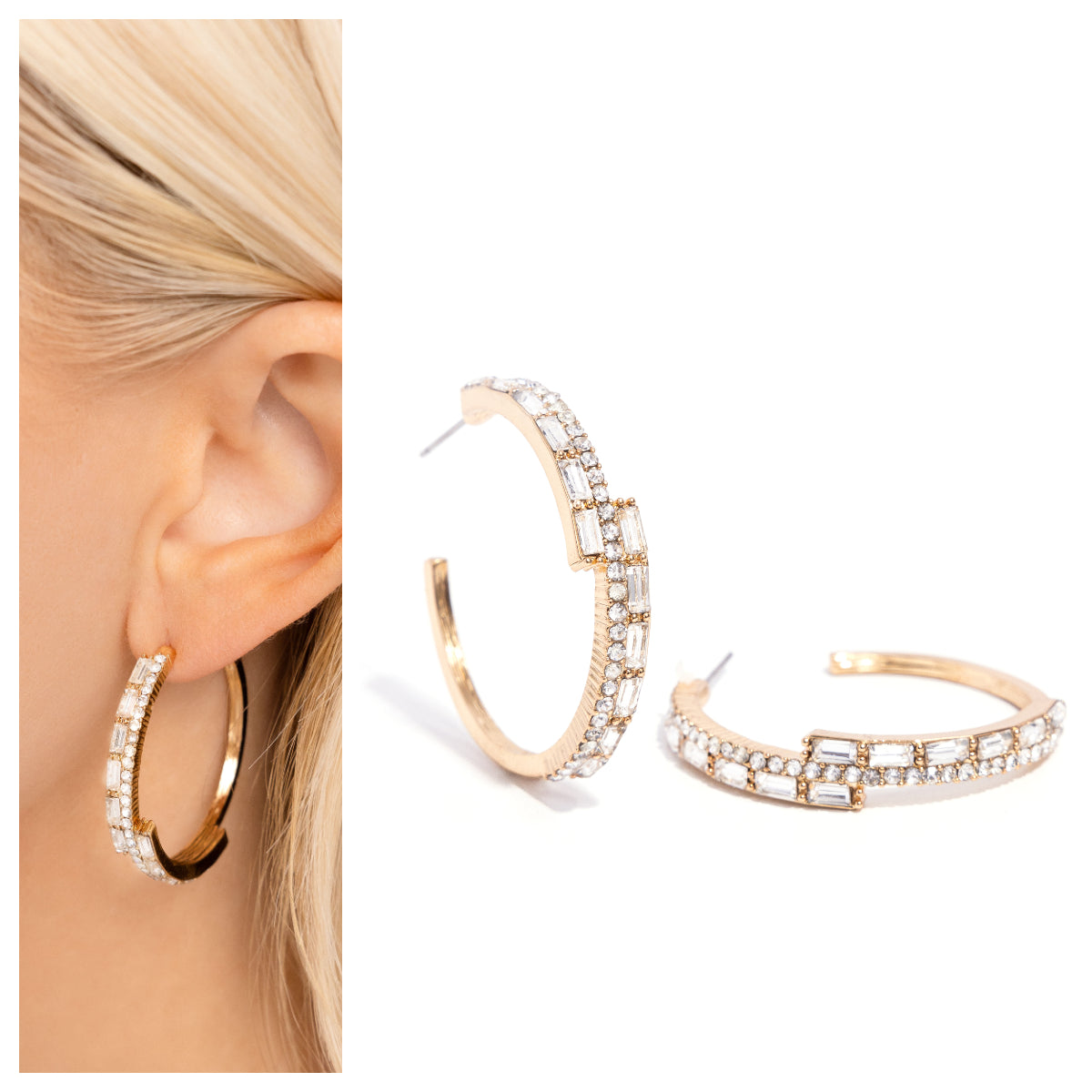 Infused with glistening white rhinestones a thin gold hoop encircles the ear. Pressed in gold-pronged fittings emerald-cut white gems delicately swoop asymmetrically along the gold hoop for additional glitz, completing the demurely layered look. Earring attaches to a standard post fitting. Hoop measures approximately 1 1/2" in diameter.