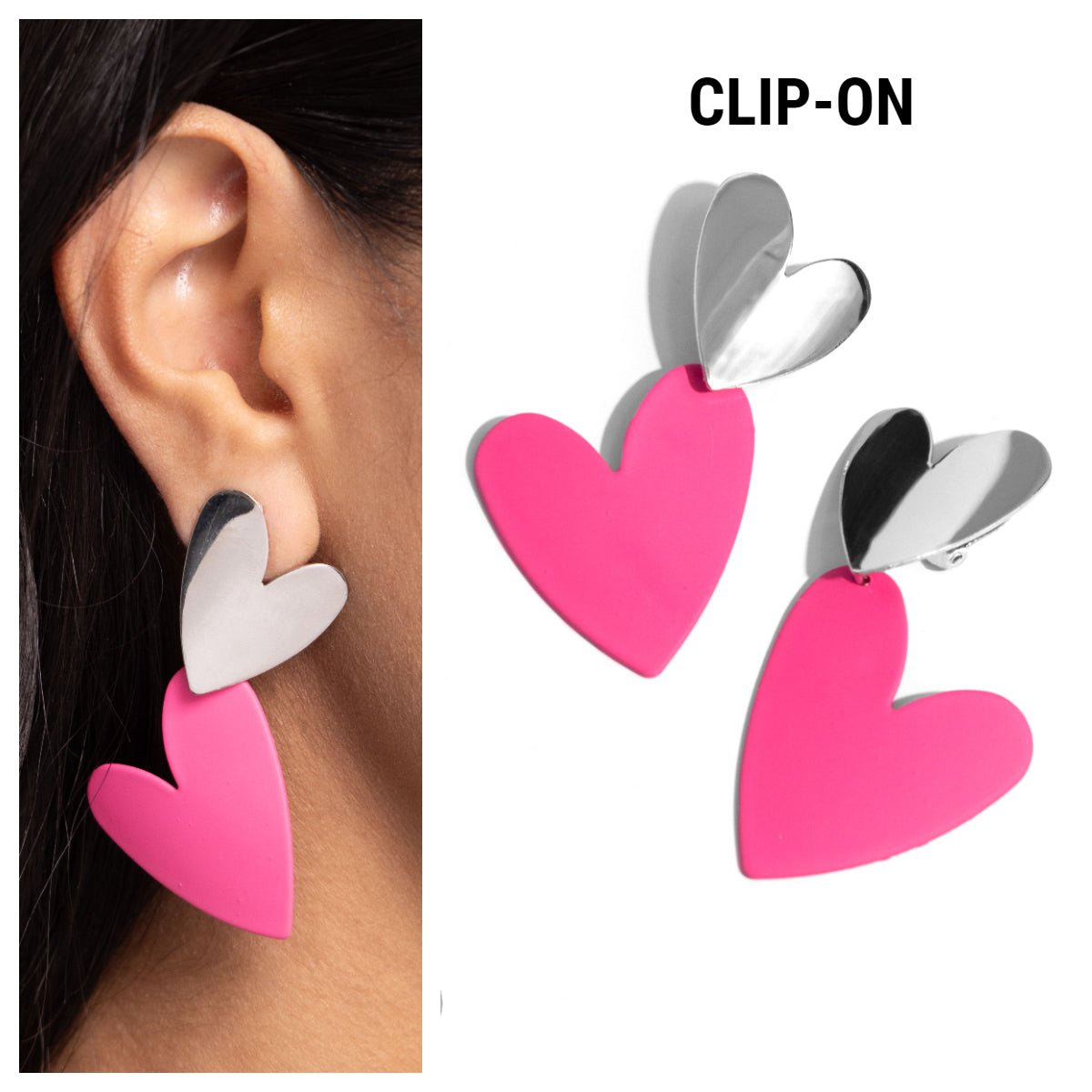 Dangling from a silver heart frame, another heart frame, this time an oversized one, features hot pink paint, creating an attention-grabbing romantic statement below the ear. Earring attaches to a standard clip-on fitting.