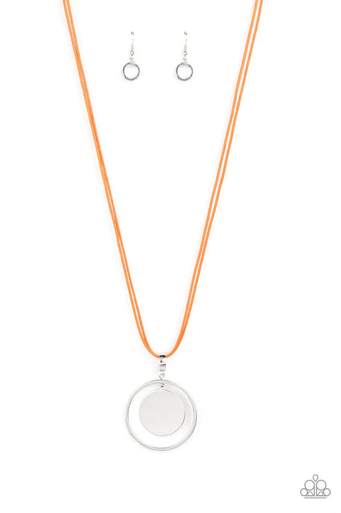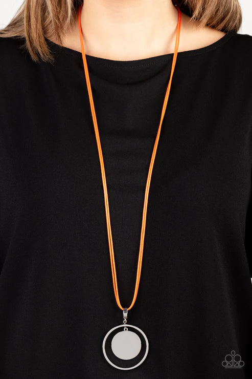 A silver disc swings from the top of an airy silver hoop, creating a shimmery pendant at the bottom of lengthened orange cords for a colorful fashion. Features an adjustable clasp closure.