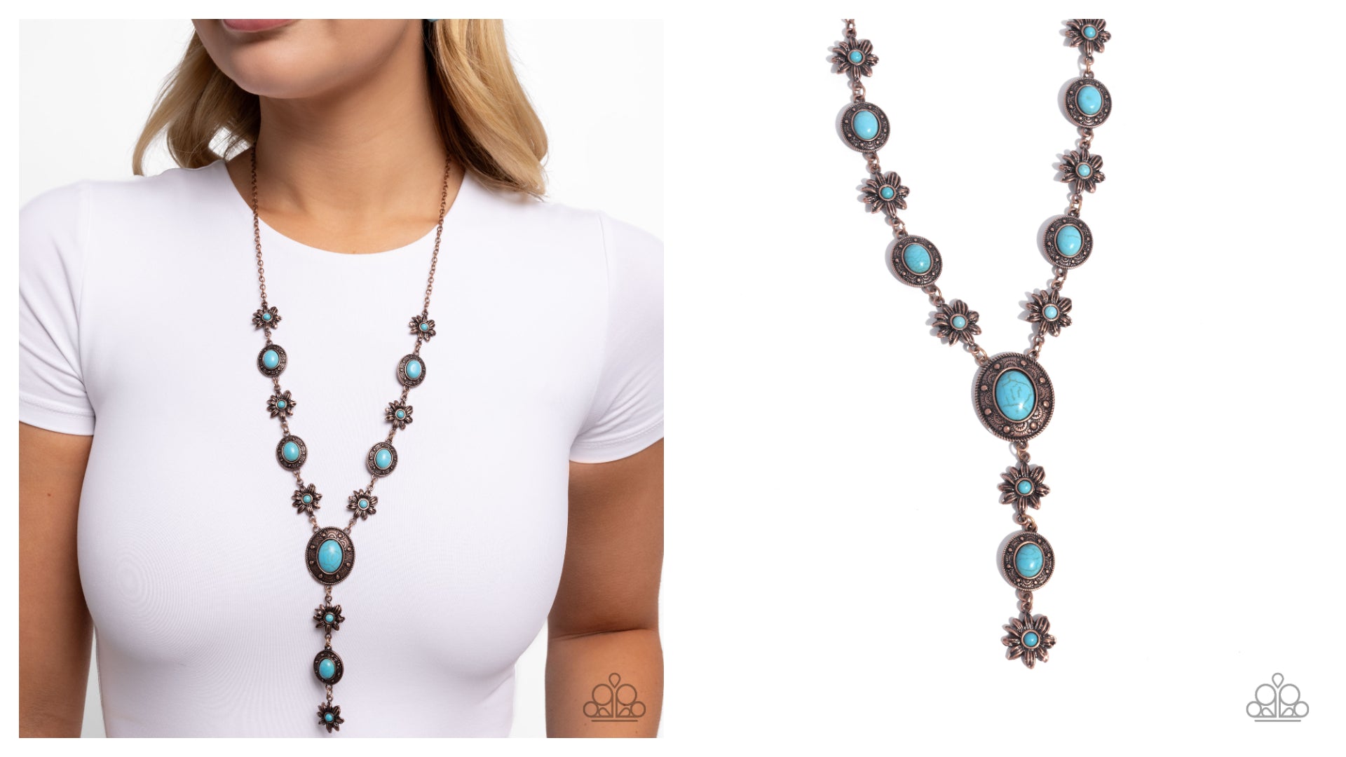 A collection of oval turquoise stones is encased in antique copper frames, creating an elegant Y-shaped design. Alternating with the turquoise stones, antique copper daisy designs with turquoise stone centers provide a delicate floral contrast. Features an adjustable clasp closure. As the stone elements in this piece are natural, some color variation is normal.