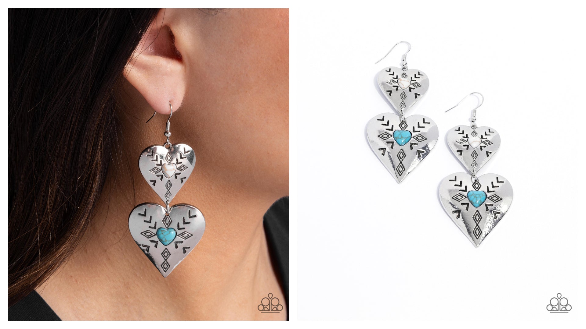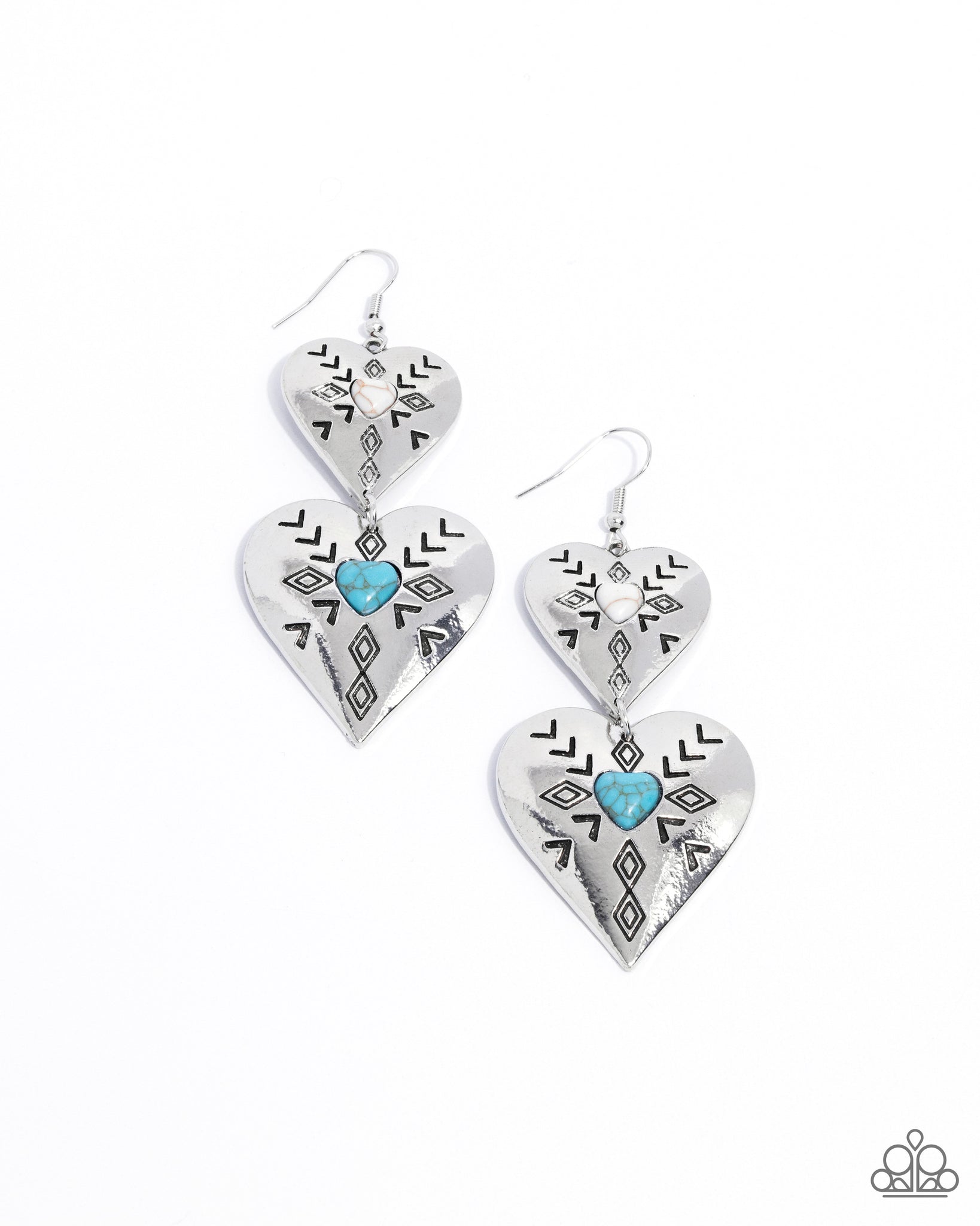 Stamped in rustic patterns, a silver heart frame delicately links with a larger silver heart frame, both dotted with white and turquoise stone hearts for a romantically realistic lure. Earring attaches to a standard fishhook fitting. As the stone elements in this piece are natural, some color variation is normal.