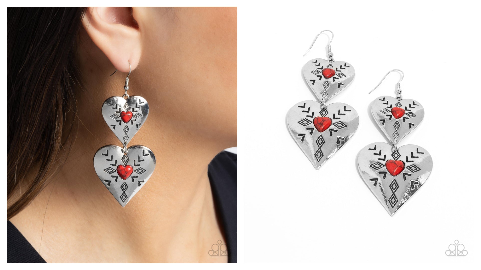 Stamped in rustic patterns, a silver heart frame delicately links with a larger silver heart frame, both dotted with red stone hearts for a romantically realistic lure. Earring attaches to a standard fishhook fitting. As the stone elements in this piece are natural, some color variation is normal.
