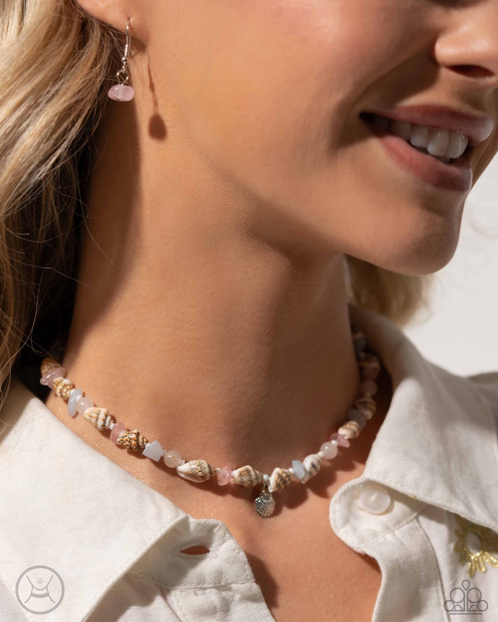 Infused along an invisible string, a collection of white seashells, pearly white seed beads, and pink, blue, and white stones coalesce around the collar. A silver starfish pendant dangles from the necklace for a beachy finish. Features an adjustable clasp closure.