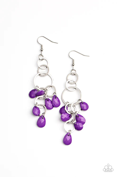 Faceted purple teardrops drip from a mismatched collection of silver rings that link into a playful chandelier, creating a flirtatious pop of color. Earring attaches to a standard fishhook fitting.