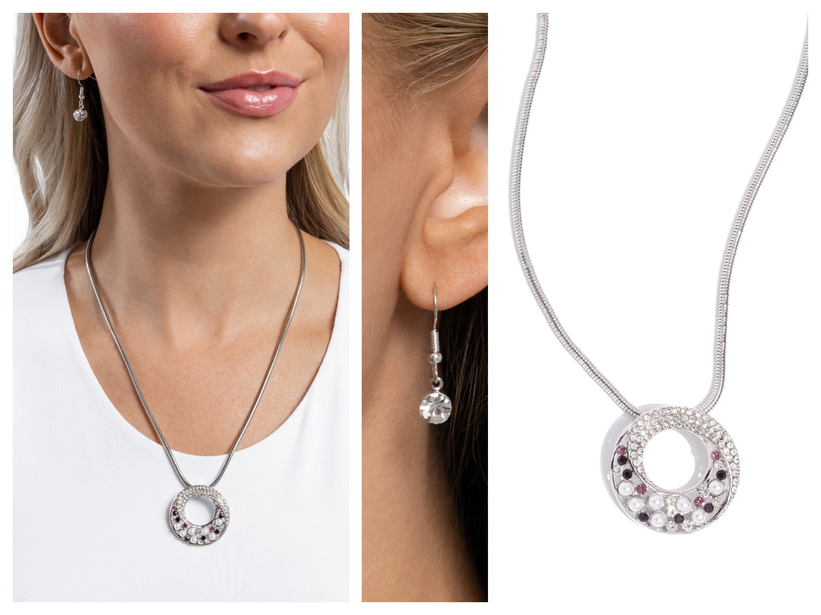 Glittering from a silver snake chain, an airy silver pendant swirls with dainty white, amethyst, and light amethyst rhinestones, gems, and white pearls in a haphazard, scattered pattern for the ultimate blinged-out statement. Features an adjustable clasp closure.