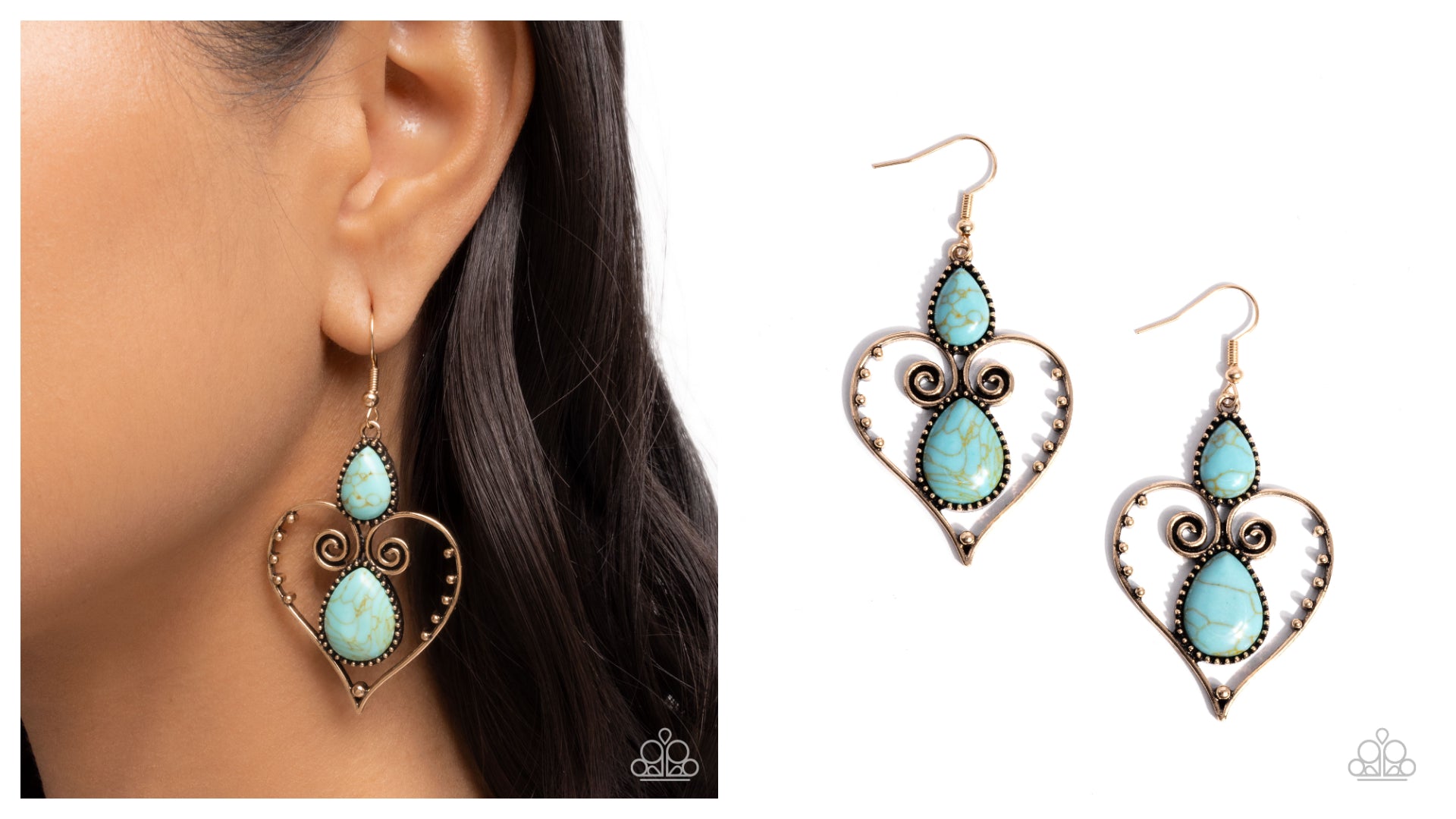 Heart-shaped gold frames, adorned with intricate swirls and dotted accents, encase teardrop-shaped marbled turquoise stones. As the stone elements in this piece are natural, some color variation is normal. Earring attaches to a standard fishhook fitting.