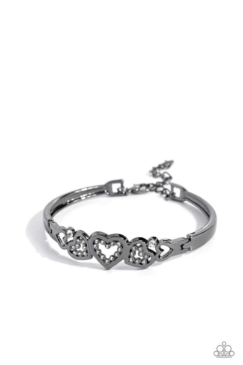 Mismatched gunmetal heart frames flirtatiously coalesce into a charming centerpiece that delicately hinges to two curving gunmetal frames, resulting in a versatile cuff-like bracelet. Glittery white rhinestones twinkle inside the centermost hearts, adding romantic hints of sparkle. Features an adjustable clasp closure.