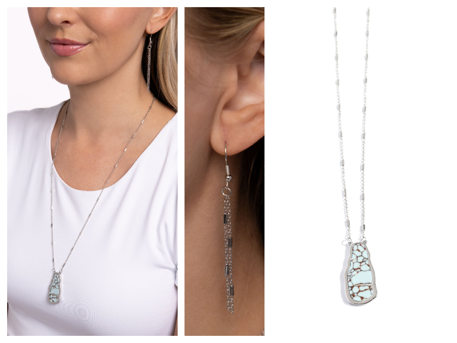 Marbled with brown, a light blue stone is pressed in a wavy, abstract silver frame, creating a stark contrast of color against the neckline from a silver-barred chain. Features an adjustable clasp closure. As the stone elements in this piece are natural, some color variation is normal.