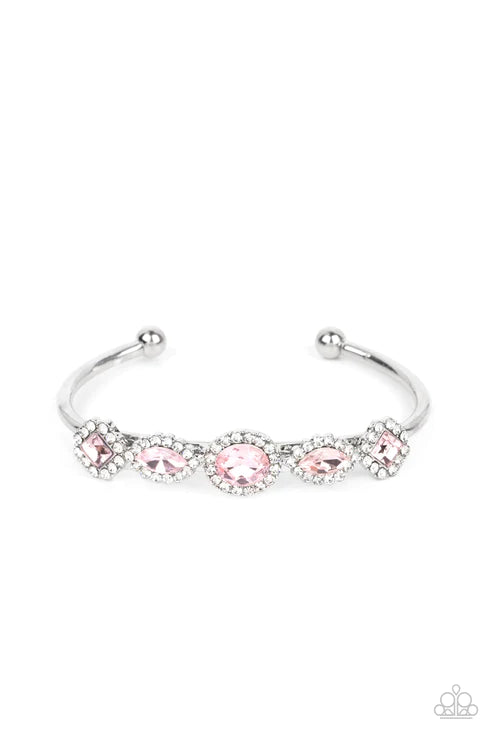 Bordered in glassy white rhinestones, mismatched pink gems alternate across the front of a dainty silver cuff for a sparkly fashion.