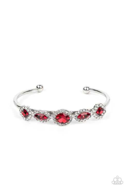 Bordered in glassy white rhinestones, mismatched red gems alternate across the front of a dainty silver cuff for a sparkly fashion.