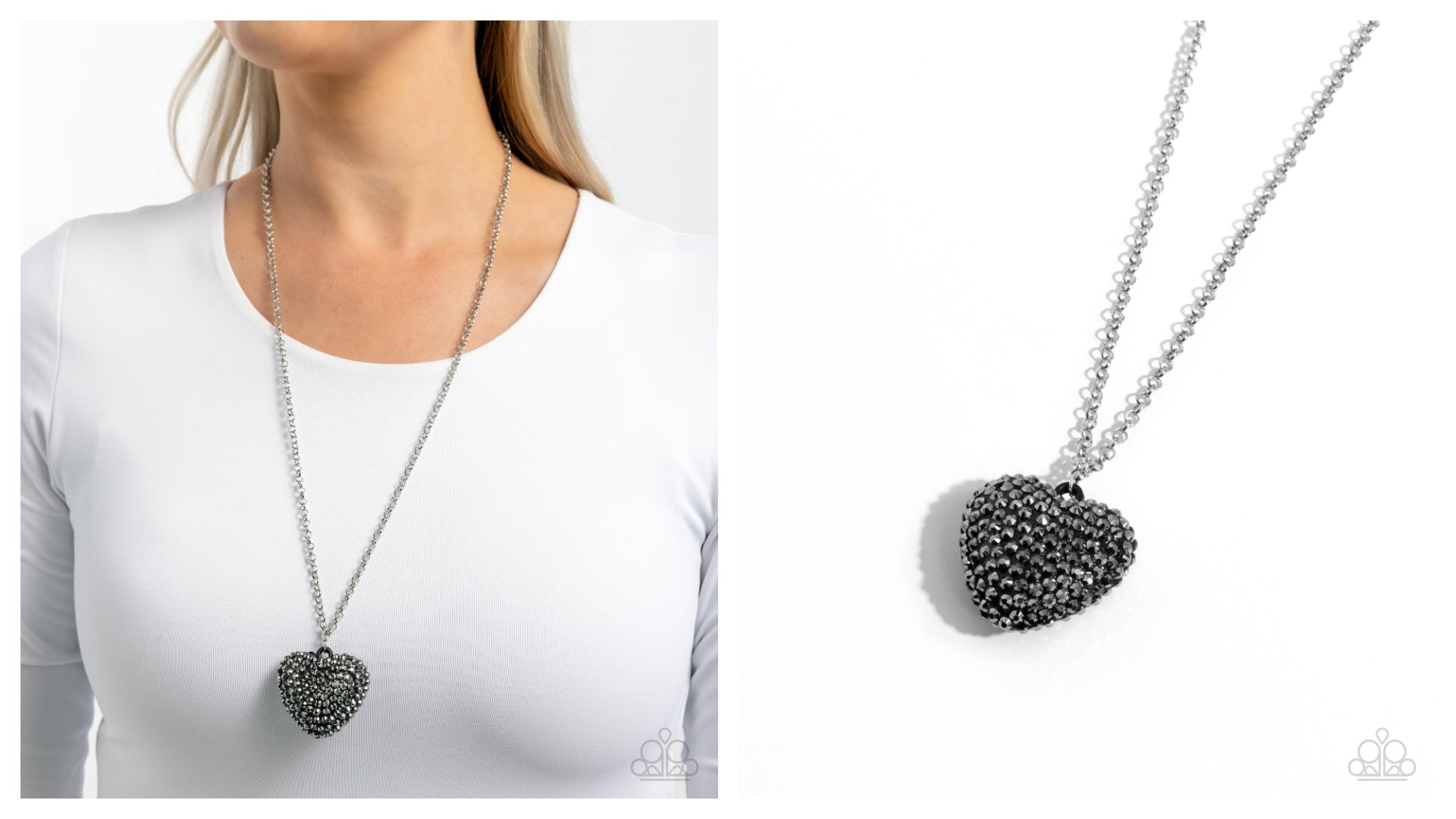 A dramatically oversized heart frame is encrusted in row after row of dazzling hematite rhinestones from a silver chain, resulting in a heart-racing sparkle below the collar. Features an adjustable clasp closure.