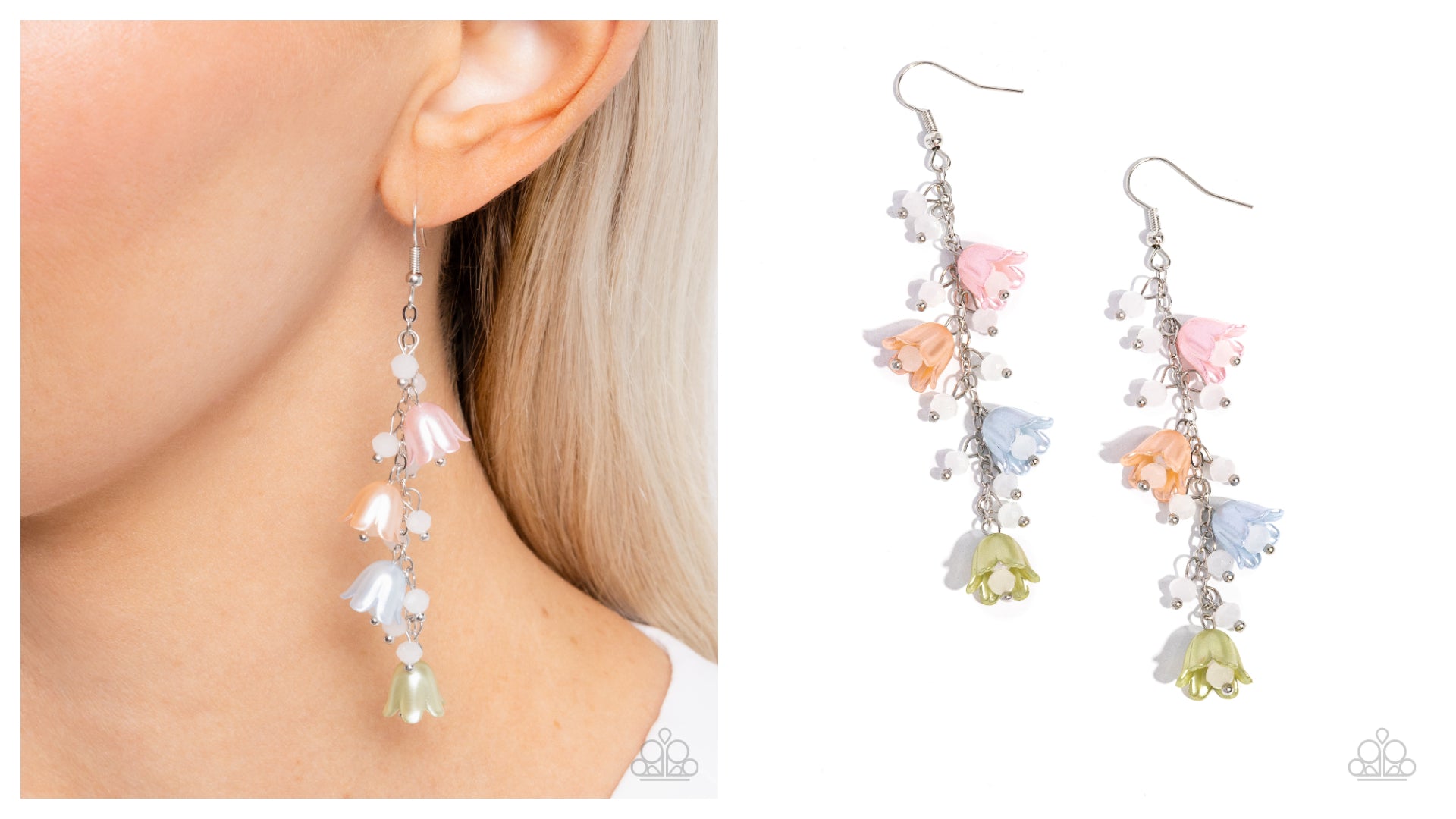 Blooming from a silver-chained vine, a collection of baby pink, Peach Fuzz, Winter Sky, and Fern pearly tulips, with faceted white bead and silver studded centers, cascades below the ear for a polished bouquet of color. Additional faceted white beads swing alongside the flowers for a whimsical finish. Earring attaches to a standard fishhook fitting.