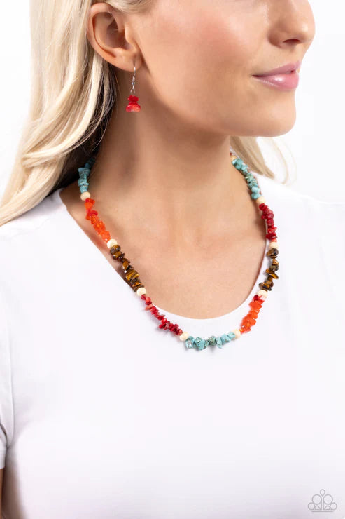 Infused on an invisible wire, chiseled turquoise, red, orange, and tiger's eye stones coalesce around the collar for a colorfully, earthy statement. White wood beads sporadically dot amongst the chiseled collection for an additional artisanal touch. Features an adjustable clasp closure. As the stone elements in this piece are natural, some color variation is normal.