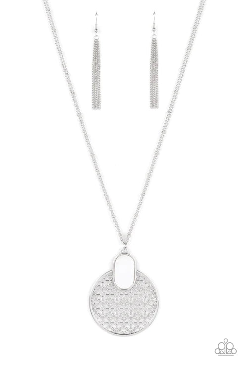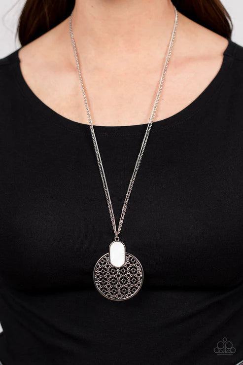 Featuring a faux shell finish, a flat white accent piece embellishes the top of an oversized silver circle filled with an airy decorative motif. The colorful pendant glides on a classic silver chain and dainty silver satellite chain, creating a whimsical display. Features an adjustable clasp closure.