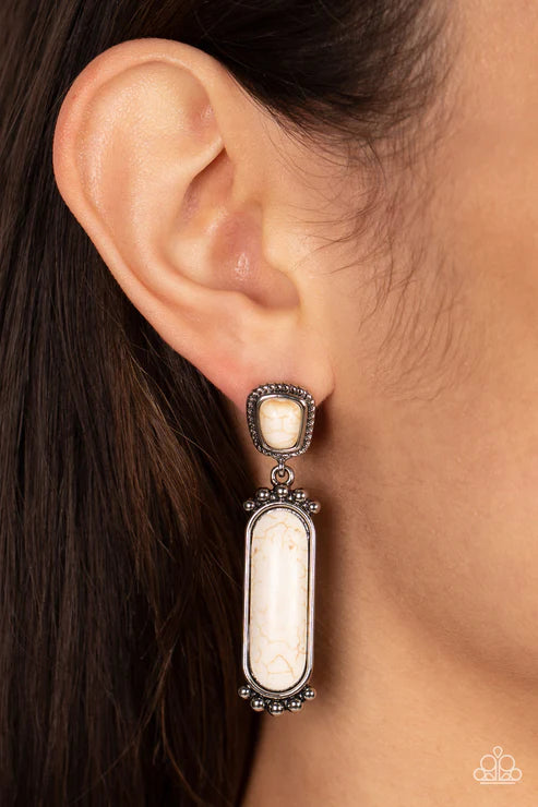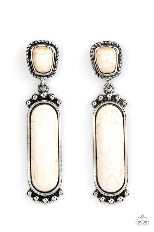 Bordered in a silver rope-like frame, an asymmetrical white stone links with an oversized oval white stone encased in a pronged silver frame for an authentic southwestern inspired style. Earring attaches to a standard post fitting.