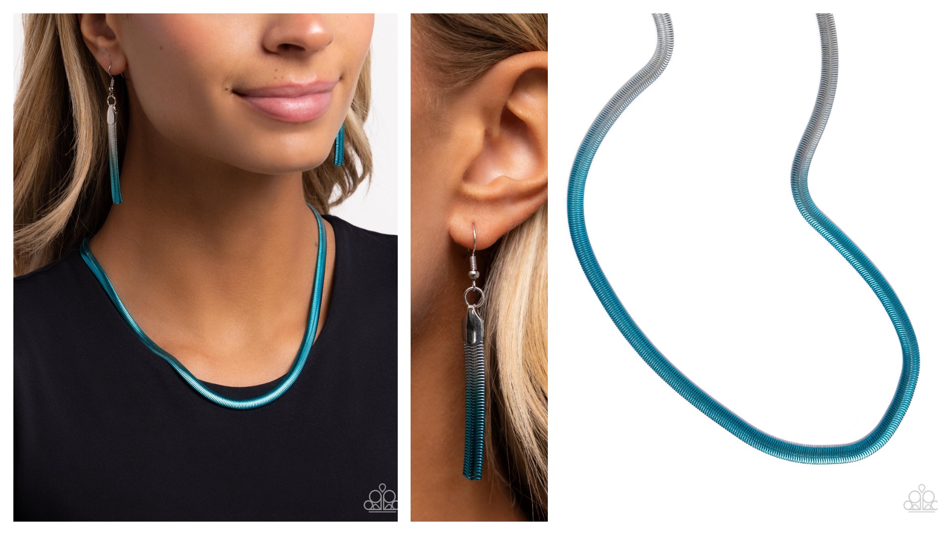 Featuring a spray paint effect, a silver snake chain slowly fades from silver to blue as it loops around the neckline for a charismatically colorful display. Features an adjustable clasp closure.