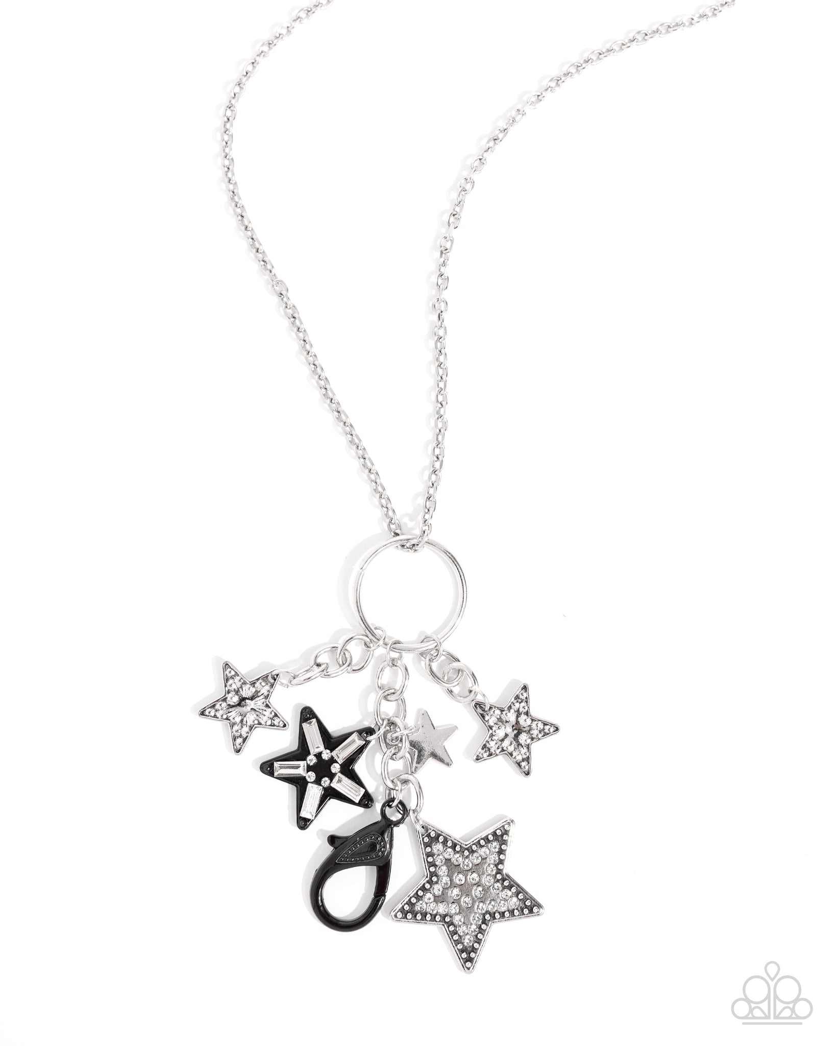 A collection of various stars, including a white rhinestone and stud-embellished star, a solitaire silver star, a black-painted star embellished with white rhinestones and emerald-cut gems, and white rhinestone-embellished stars cascade from a sleek silver ring at the bottom of a lengthened silver chain, creating a cosmic-inspired display. A black-painted lobster clasp hangs from the bottom of the design to allow a name badge or other item to be attached. Features an adjustable clasp closure. As the stone elements in this piece are natural, some color variation is normal.