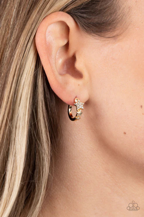 A shiny gold bar curls around the ear into a dainty hoop. Three gold stars gradually increase in size as they climb the curve of the hoop, with the biggest star emblazoned with white crystal-like rhinestones across its surface. Earring attaches to a standard post fitting. Hoop measures approximately 1/2" in diameter.
