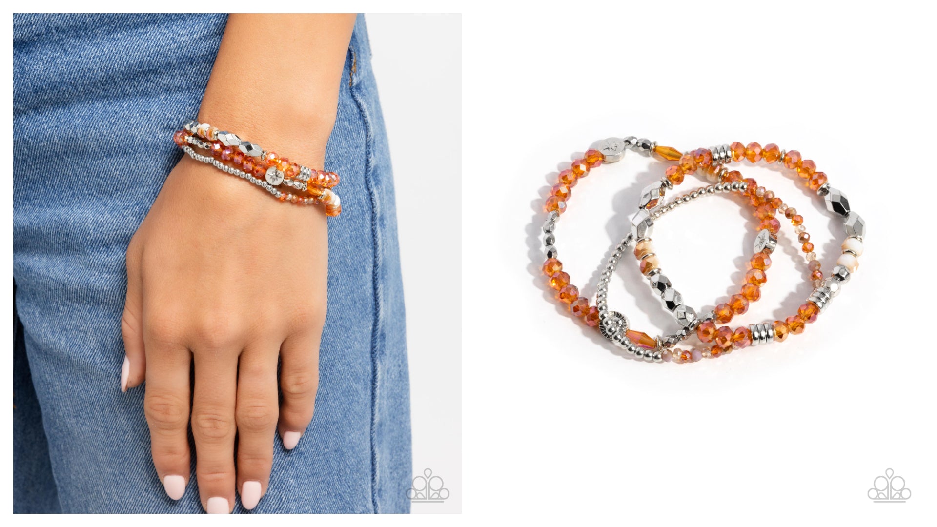 Infused along elastic stretchy bands, a collection of transparent orange, orange UV shimmery, faceted silver, silver discs, star-embellished silver, and round silver beads pattern and stack atop the wrist in a triad display for a pop of cosmic color.